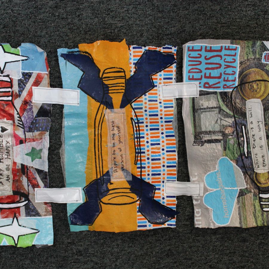 Offering an opportunity for learners and their families to engage in art, the project was run using a ‘family learning’ delivery model. Participants worked collaboratively with artists on-site to initiate the process of making artwork using single-use plastic bags, each with a personal message. A wallet was also made and included a short story based on a recycling hero, which was gifted to their families.
